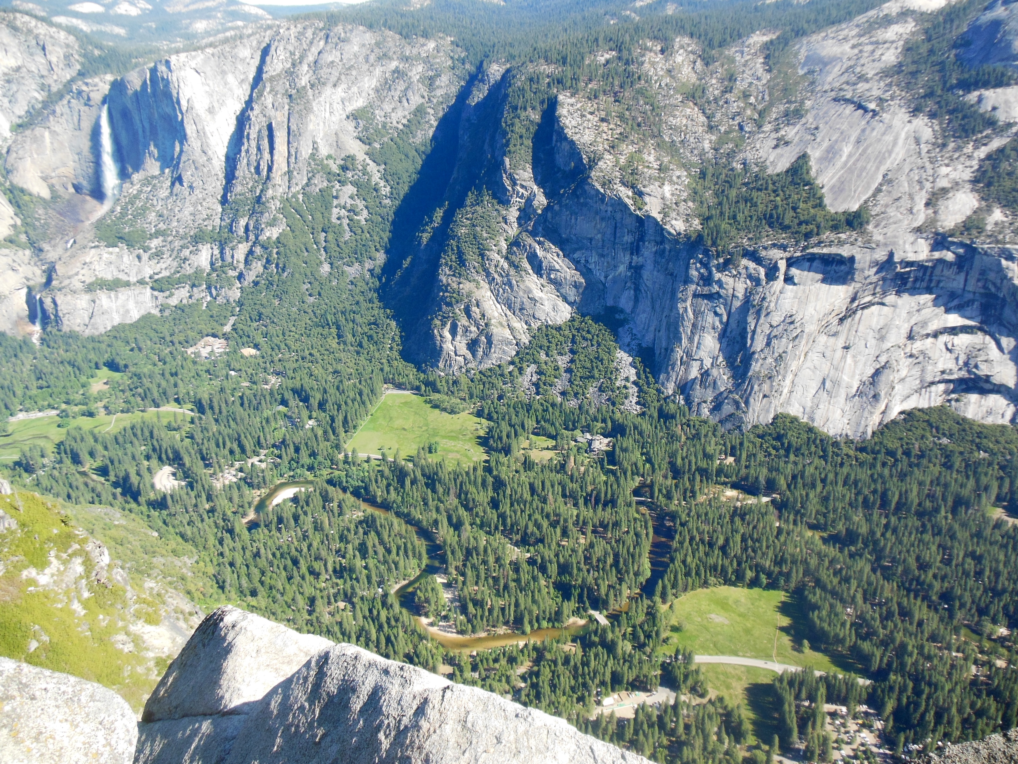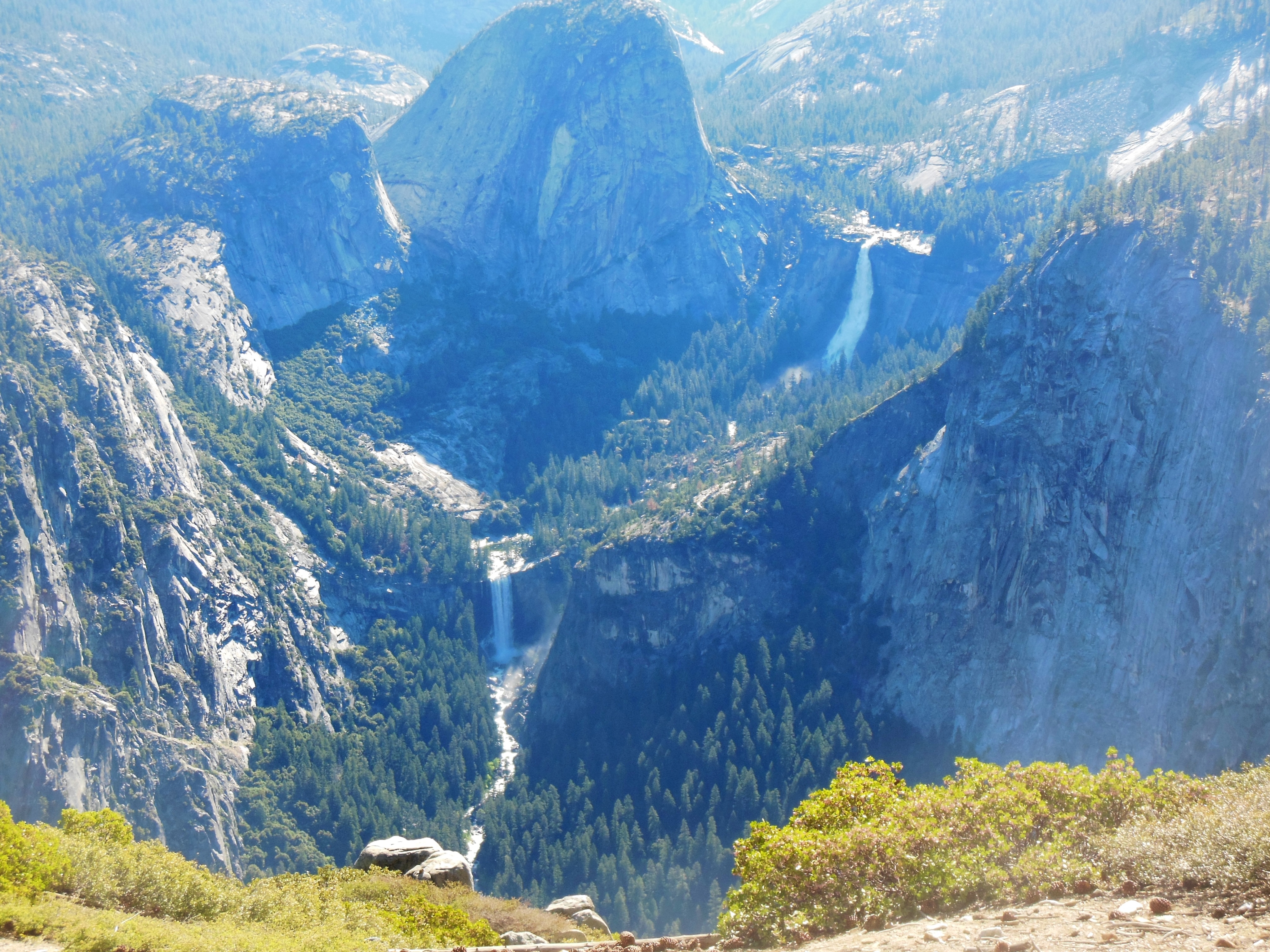 Our first hike was at a farther end of the valley so we took the shuttle. We were hiking to the Vernal Falls footbridge. Regular readers may remember the picture of Vernal Falls from Glacier Point posted for Saturday. The footbridge is a hike with a 400 foot elevation gain. It is paved and well traveled (thus smaller likelihood of bears.) Once again the view is great, the hike through forests and along cliffs.