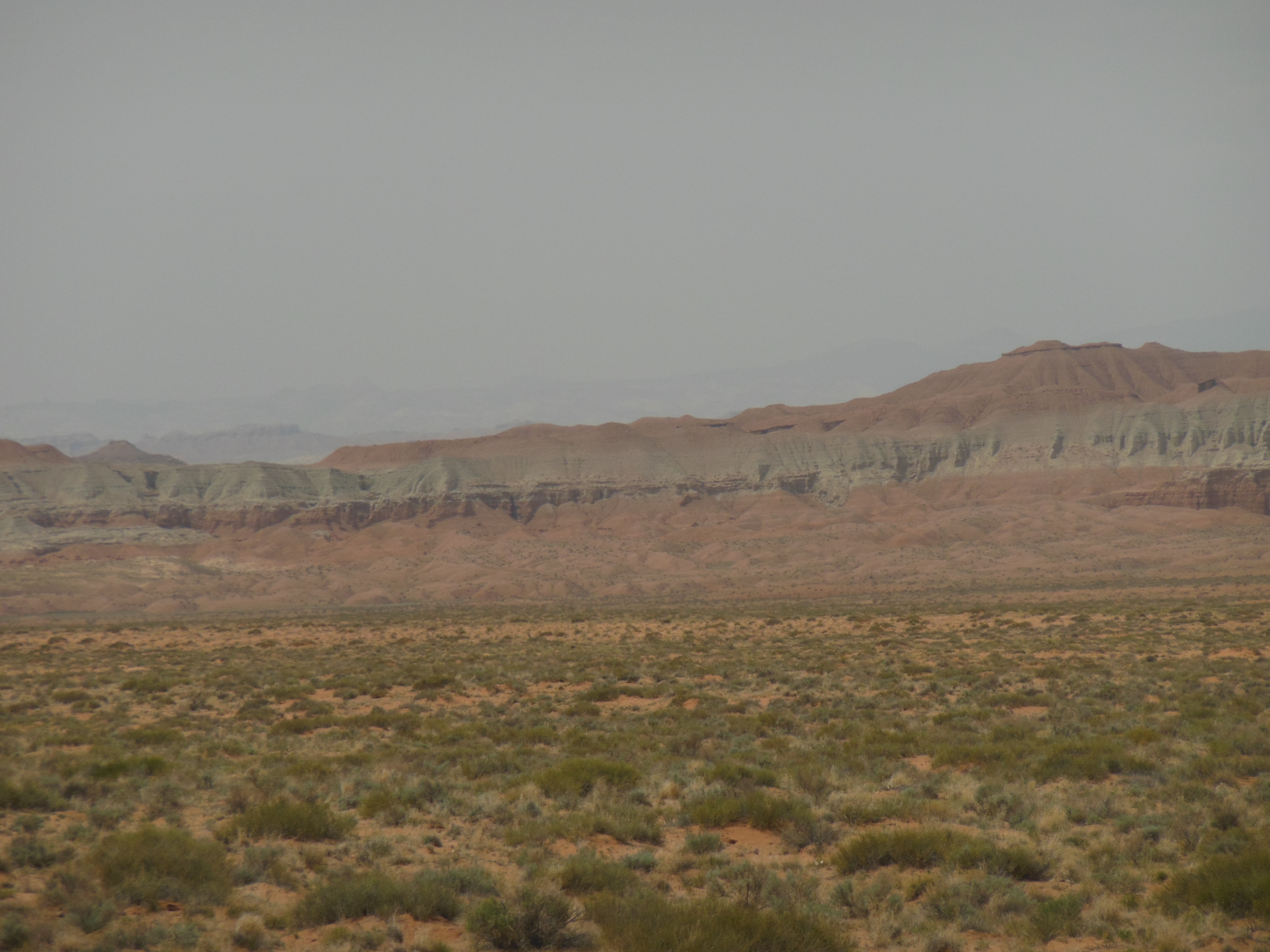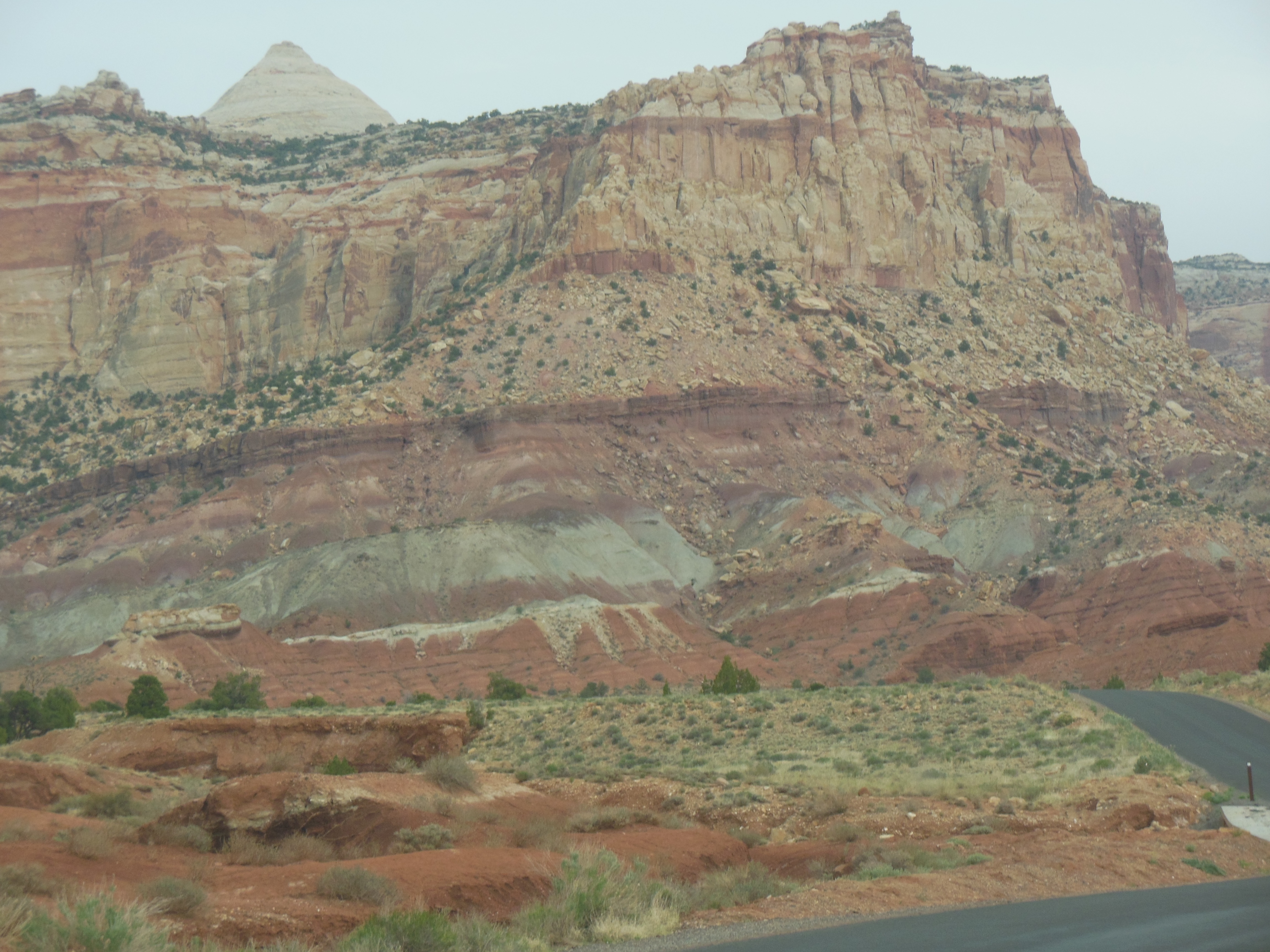 We left the Rockies, Glenwood Canyon,and Colorado National Mounument behind and were driving through rolling hills first. Then we started seeing these various uplift views of tall ridges and cliffs of varying color, with some but minimal vegetation. The cliffs get taller and mountains are in the background as we get closer to Capitol Reef.