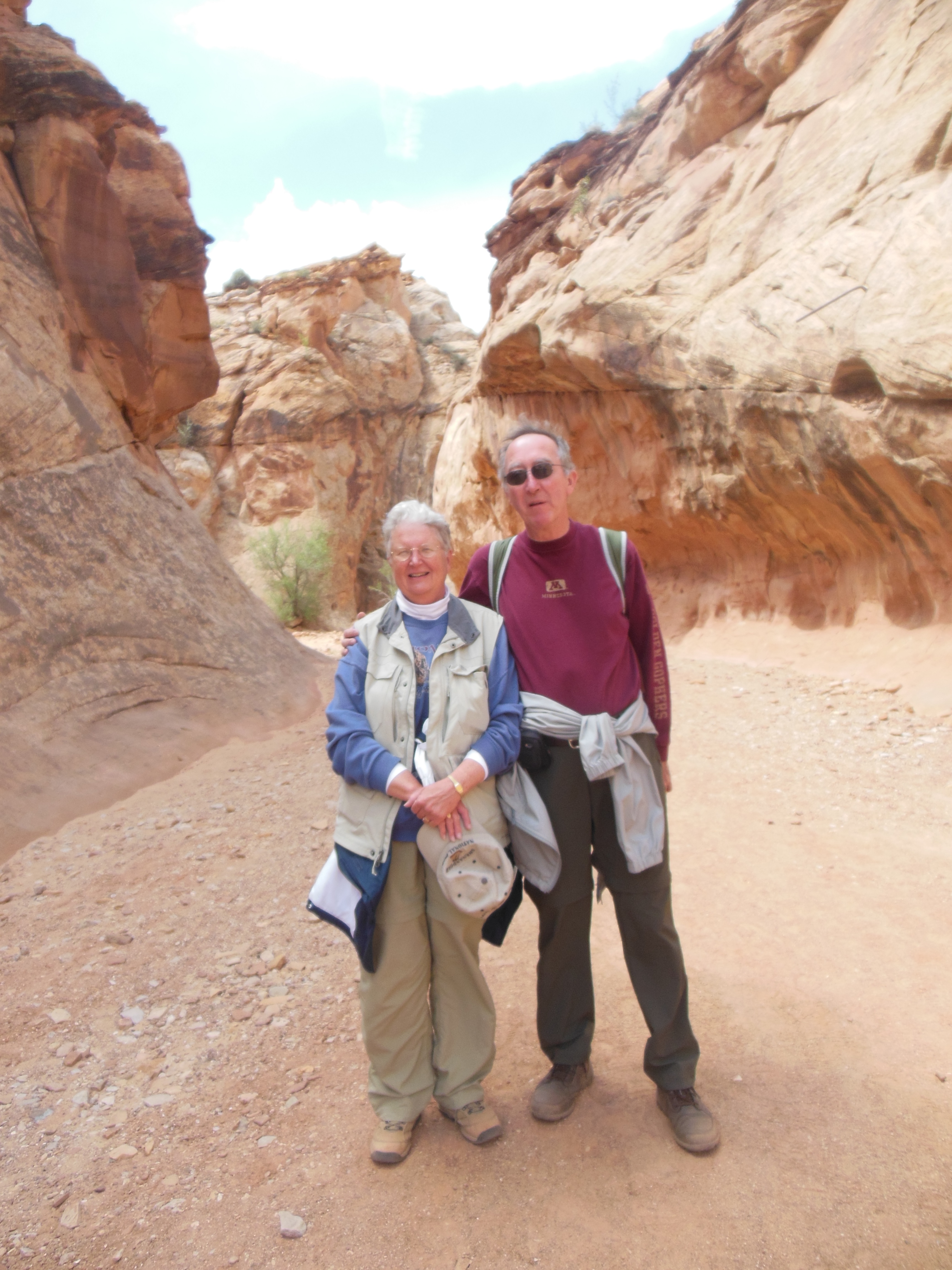 We spent the day driving and hiking. One of the hikes, Capitol Gorge, was a narrow canyon that had been the only and unpaved road through the area. I am not sure our pictures always show the great height and vastness of the cliffs and area. We kept looking around and commenting on how stupendous the views are. The clouds threatened rain often and delivered sporadically.