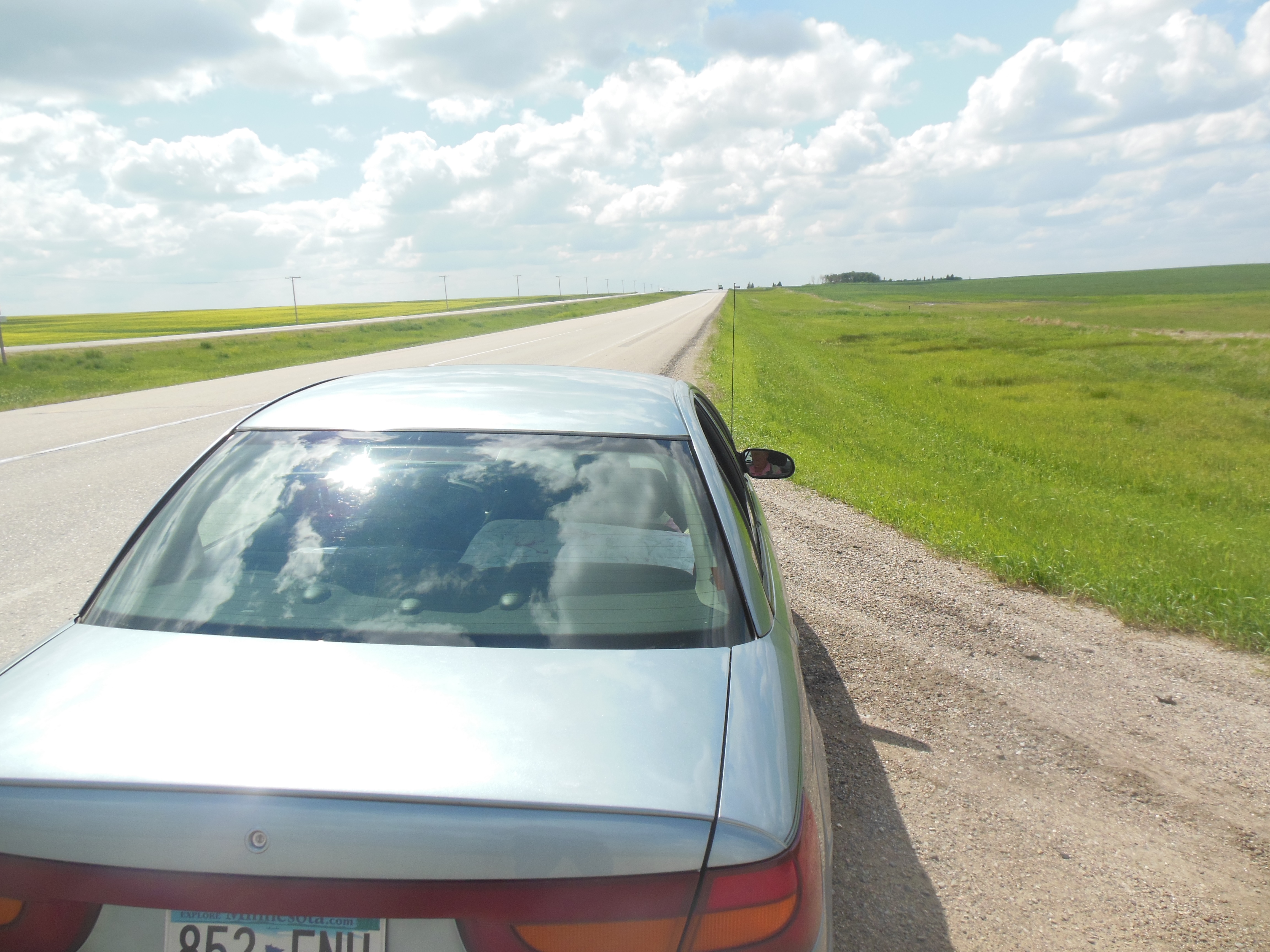 Even when you have a plan, unexpected things happen. Like a flat tire on the trans Canada Highway just east of Grenfel, Saskatchewan. Somehow the tire got a gash about 2 inches long on the side of the tire facing away from the road. It went flat quickly but we were able to get to the side of the road safely.