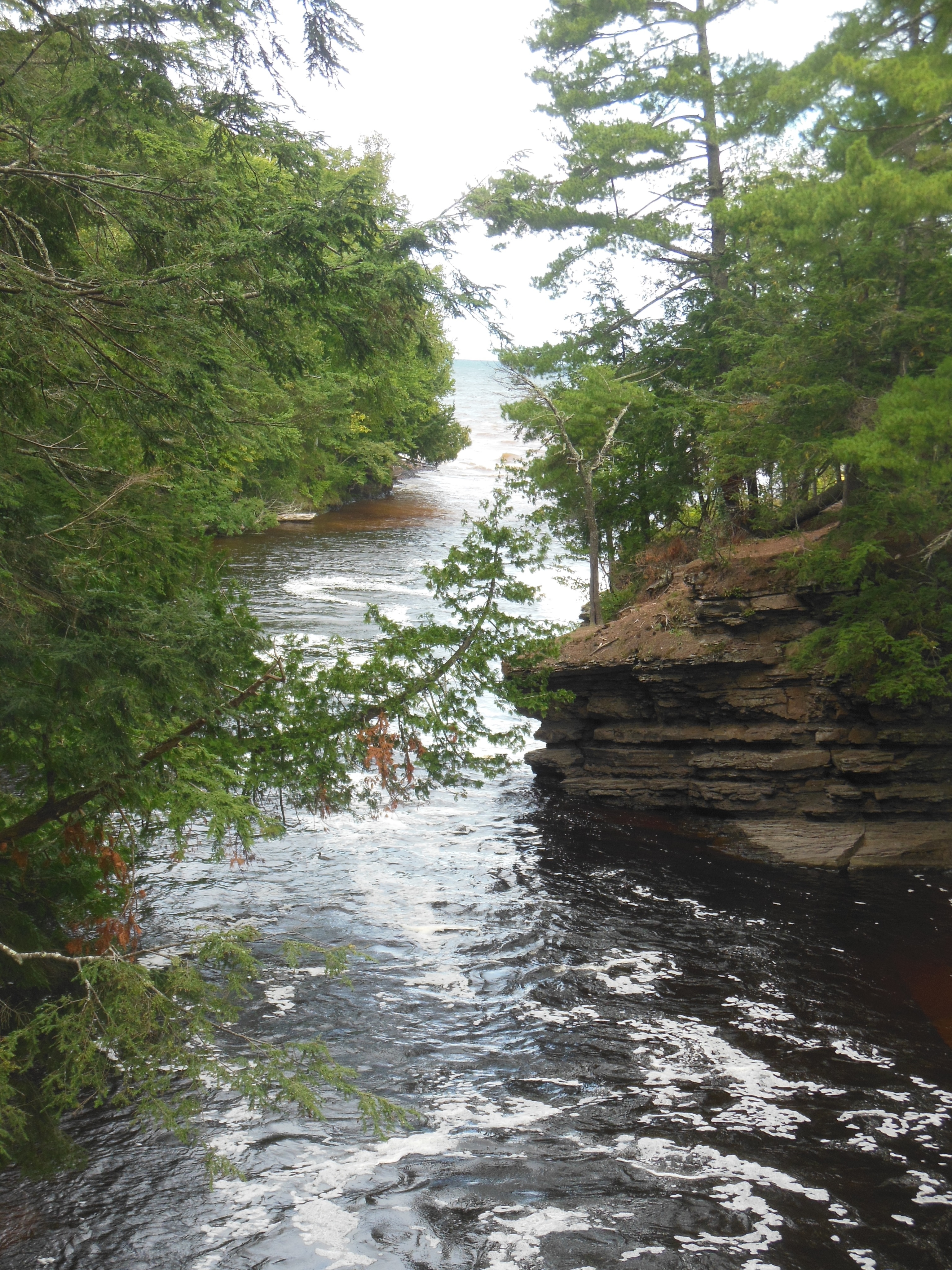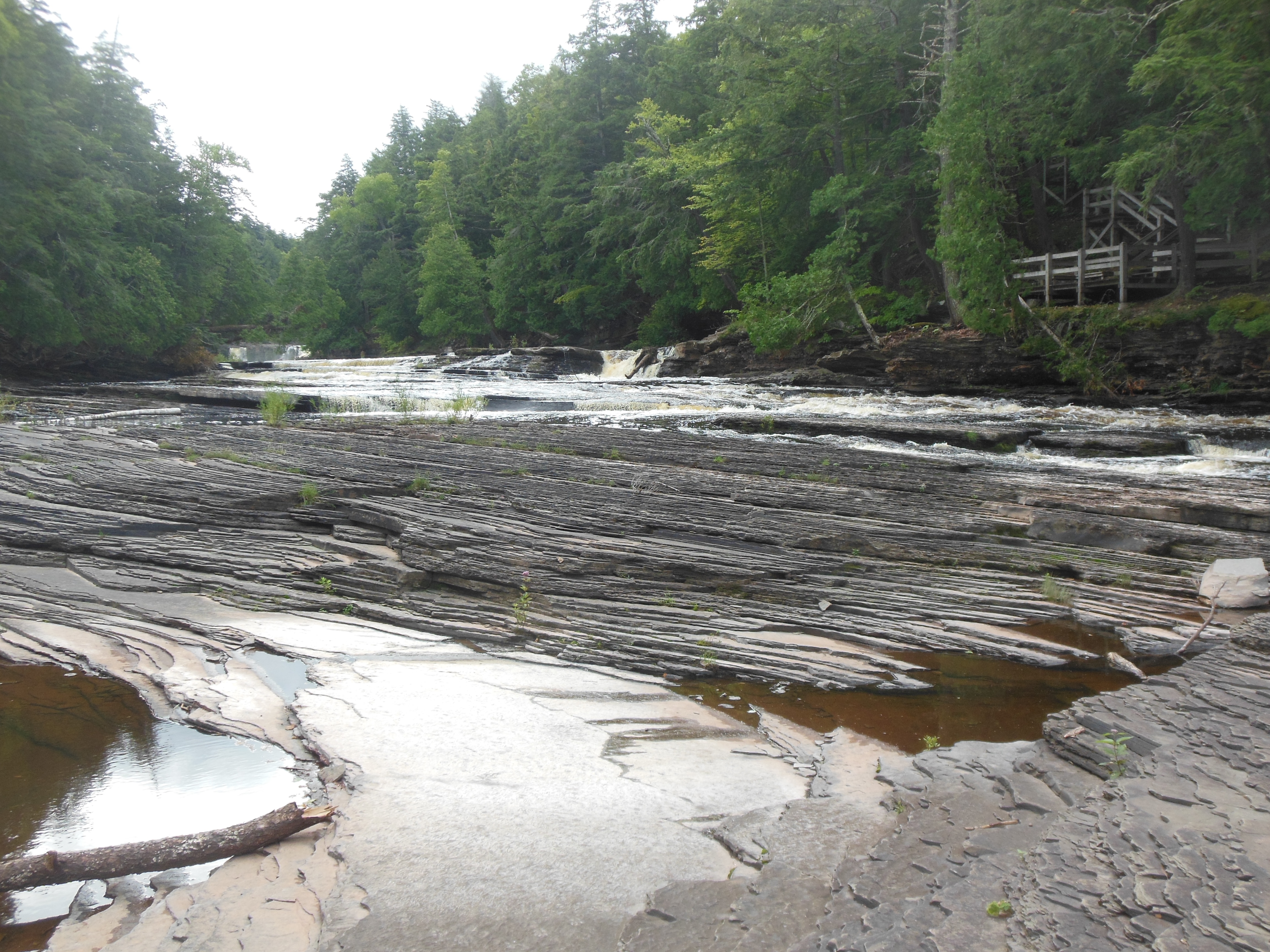 At the western end of the park and mountains, Presque Isle River forms several falls just before dumping its water into Lake Superior. The hike to the falls required us to take hundreds of stairs along boardwalks providing varying views of the falls and rapids. The swirling water creates several areas of smooth, circular potholes in the rock. Part of the creekbed is layered with rocks laid down when ancient oceans covered the area.