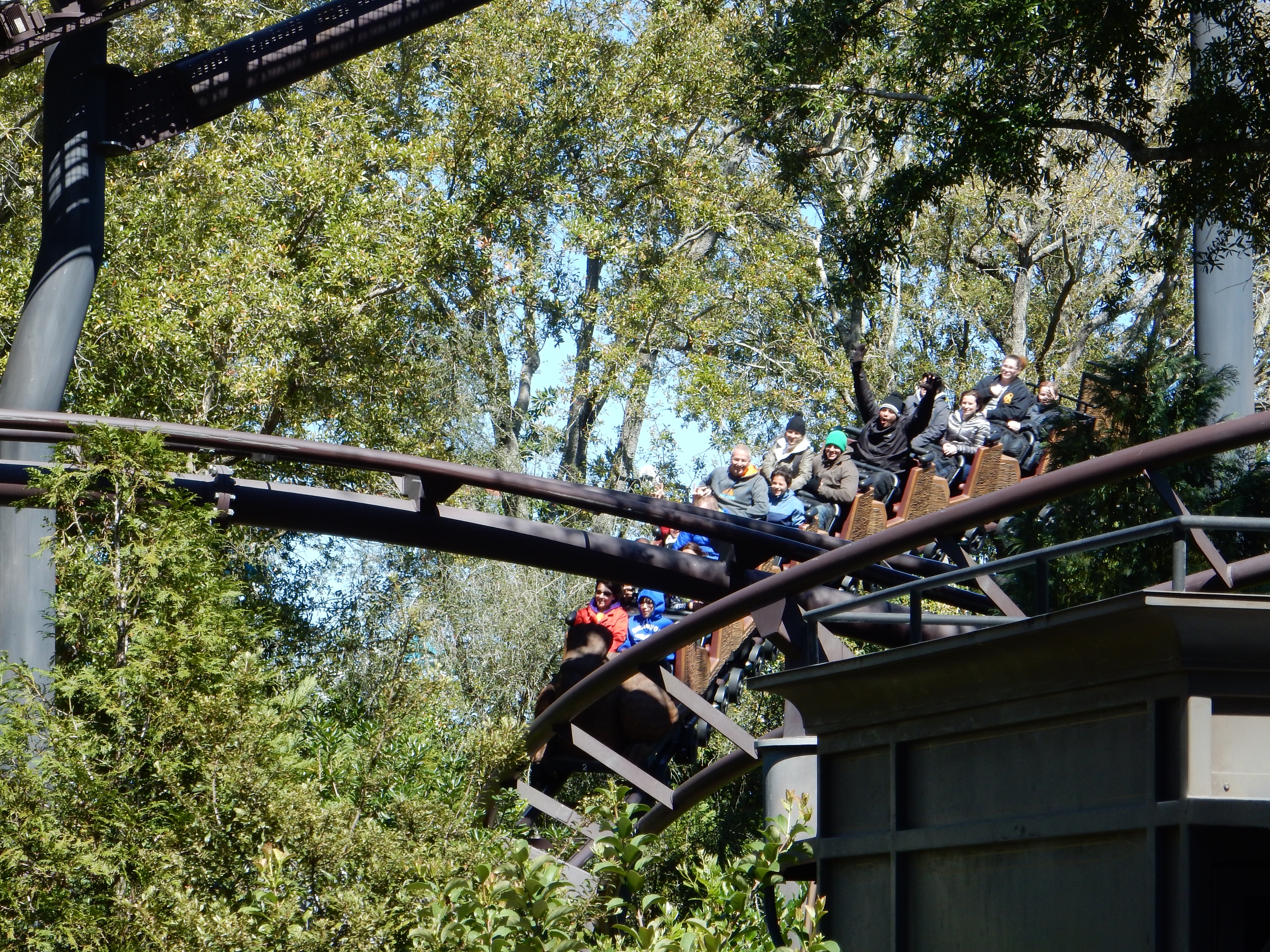 Chris really went out on a limb today in the Harry Potter world. Having already experienced the Spiderman ride, she went on two other Potter rides that had been recommended and which she thought might be tame. Both turned out to be eye closers. The Flight of the Hippogriff is termed a “family friendly roller coaster”. In my mind it was pleasant, certainly had some fast turns but very doable. For Chris, it was definitely a challenge, eyes kept closed and “let’s take a break” after the ride to settle her stomach.