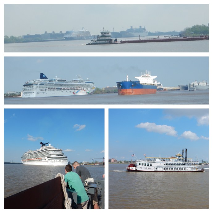 After walking the neighborhood and the levee, we arrived at the Algiers Point Ferry Terminal. We took the ferry across the Mississippi RIver to a dock at Canal Street. The ferry charges $2 per person, exact cash only. We had to use some quarters to have the exact change. For the return trip, we had to make sure we bought just one post card to have four one dollar bills with us. We did encounter two women on the return trip asking people waiting in line if they had change. We saw them on the ferry so evidently they found a Good Samaritan with change.