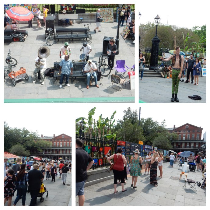We left the Mint and headed to Jackson Square. Jackson Square is a large green space, with St. Louis Cathedral, the Cabildo Museum (history) and the Presbytere Museum (culture) flanking the Cathedral on the northwest side of the square. Three sides of the square were home to artists selling their wares and buskers performing for the tourists. One or two musical groups were always performing so you were serenaded as you strolled along inspecting the art. Even inside the two museums, you could hear the music. (Jackson Square is named after Andrew Jackson, the hero of the Battle of New Orleans where the Americans defeated the British in the War of 1812.)