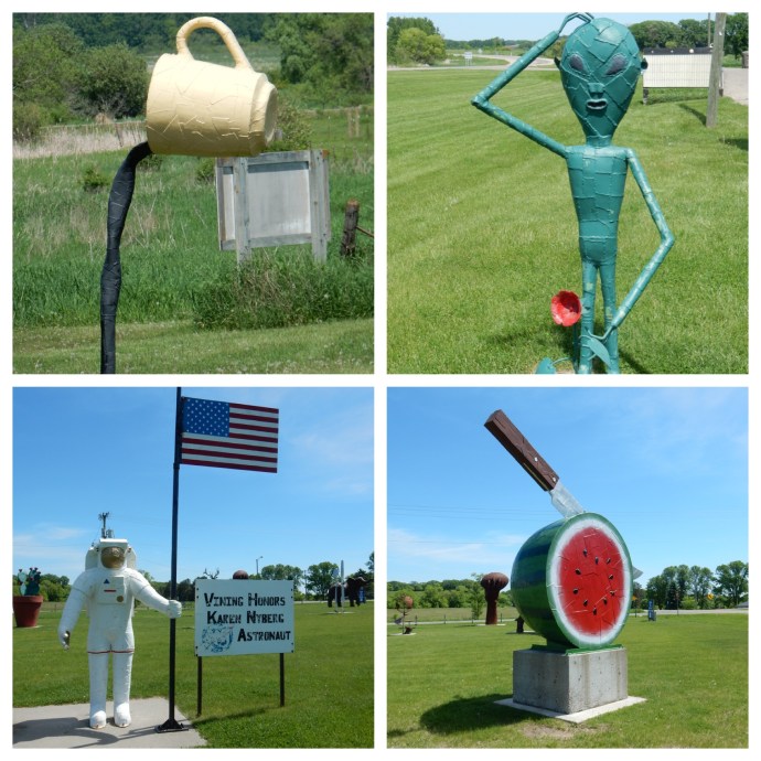 After the bike ride, we went back into Battle Lake and stopped at Art of the Lakes Studio. Nice art work. The studio has been around for fifty years and is cooperatively run by about a dozen artists. Then it was lunch at The Rusty Nail. Our next stop was in the town of Vining, home of a sculptor working in metal, Ken Nyberg. Vining, population 78, has an area next to a gas station that displays many of his whimsical works. The Nybergs’ daughter, Karen, was an U.S. astronaut who went into space in 2008 and 2013. There are numerous Ken Nyberg sculptures around the county, including Chief Wenonga in Battle Lake, and the Upper Midwest.