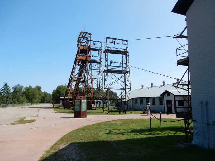 From Bovey we drove to Calumet MN to visit the Hill Annex Mine State Park and take the 1.5 hour tour. The Hill Annex mine operated from 1913 to 1978 and was the sixth most productive mine in Minnesota. There are still piles of tailings and ore that could be productive depending on future demand and economics, although near term use is very unlikely.  When operating, the mine had to be pumped to keep water out. Once the mine closed, the pumps no longer operated and portions of the pit have become a lake.  The park has displays in the old mining clubhouse but our target was the tour.