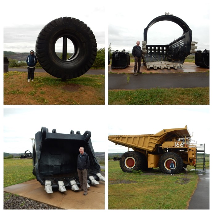 The mineview overlook allows one to look into the pit, watching the operation from the edge of the pit. This exhibit site will be moving next year as it is so close to the mining operation, that the ground underneath will be mined in 2018. We watched the construction of an access road from the depths of the mine up towards the mineview site. The mining process here consists of: the removal of overburden, the blasting of harder waste rock and ore into smaller chunks, the scooping of the ore into trucks to carry the ore to a crusher and grinders to create a fine concentrate, the pelletizing of the concentrate through dewatering and addition of bentonite clay, and then the pellets are rolled into 1/2″ balls and hardened by heating. The final pellet balls are then shipped by rail to loading docks on Lake Superior. In 1901 steam shovels dug rock with bucket capacity of 3/4 yard. Nowadays, the buckets can load 65 tons into trucks that haul 240 tons. Our pictures show out dated trucks from 20 years ago, but still huge by any standard.