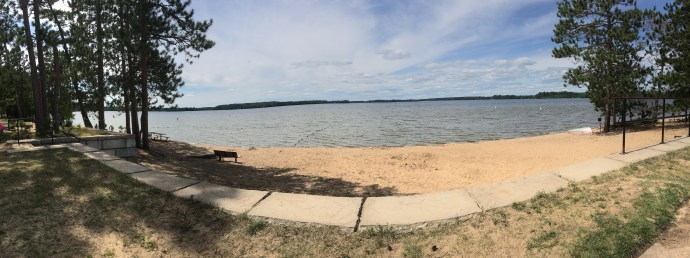 It has been a gorgeous day. For those of you in hotter climes, the temperature reached a high of about 82, light breezes and mainly sunny skies. Low tonight of 55 degrees Fahrenheit. We spent part of the afternoon and evening sitting on the beach of Pokegama Lake, 6600 acres in size and about 110 feet deep at its greatest depth. Our beach front lodging is at the Green Heron Bed and Breakfast, an excellent facility Chris found on the Internet. While the B & B is named after the green heron found locally, once again it is the sound of the loon that says “Northern Minnesota lakes” to me.