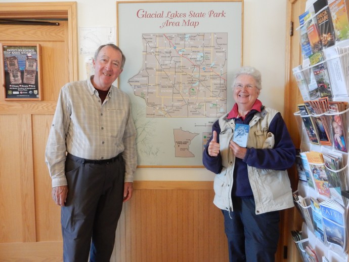 Normally when I think of Minnesota lakes, I think “Up North”, that area generally north of a line drawn through St. Cloud. However, this area of west-central Minnesota is south of that line and yet is well populated with numerous lakes, generally created by glacial action. The ranger at Glacial Lakes was not as busy and took our picture. I complained to her about the new MN DNR maps/descriptive handouts for each park that while providing larger and easier type to read, have deleted most of the background information about the park-its history, geology, wildlife, etc. They have dumbed down the information. Their new publication listing all MN State Parks is in a different format also. Rather than the 4″ x 9″ folded booklet, there is a large map with the location and list of the parks. I think it is a mistake, the map is difficult to read easily and again, has less information about each park on it. Oh, if I was in charge everything would be perfect. We hiked around a lake, noting kame (cone-shaped hills), kettles (water-filled depressions), and eskers (“a long ridge of gravel and other sediment, typically having a winding course, deposited by meltwater from a retreating glacier or ice sheet).