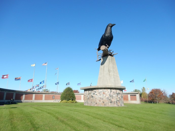 Sunday our destination was Glacial Lakes State Park. On our way there, we passed through Belgrade Minnesota and our attention was grabbed by a large statue of a crow. The Middle Fork of the Crow River rises near Belgrade and the town has constructed a memorial park to honor “who we are, what we are doing, and where we are going”. Each state’s flag flies, the picnic tables fly the flags of the seven countries (Germany, Norway, Sweden, Denmark, Ireland, Poland, and Czechoslovakia) sending early settlers to this area, and then the flags of Canada and local civic groups such as the Lions and VFW are flown. The walls have bricks memorializing local residents as well as school superintendents, local pastors, veterans, county road crew members, scouts, etc. The crow is 18 feet high and weighs 3,000 pounds.