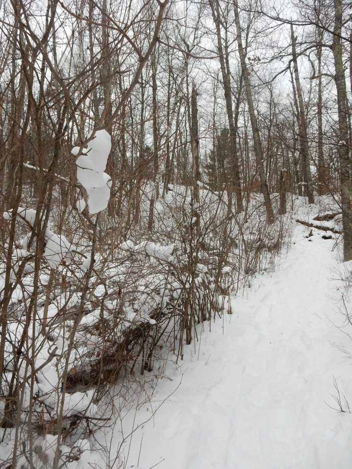 The hike was up and down hills, through woods, and past small lakes and wetlands. The color palette was mainly white and grayish brown. The green of the conifer trees was above us, closer to the blue or gray of the sky. Our eyes were normally on the path. We observed little wildlife, a few birds mainly, a squirrel here or there.