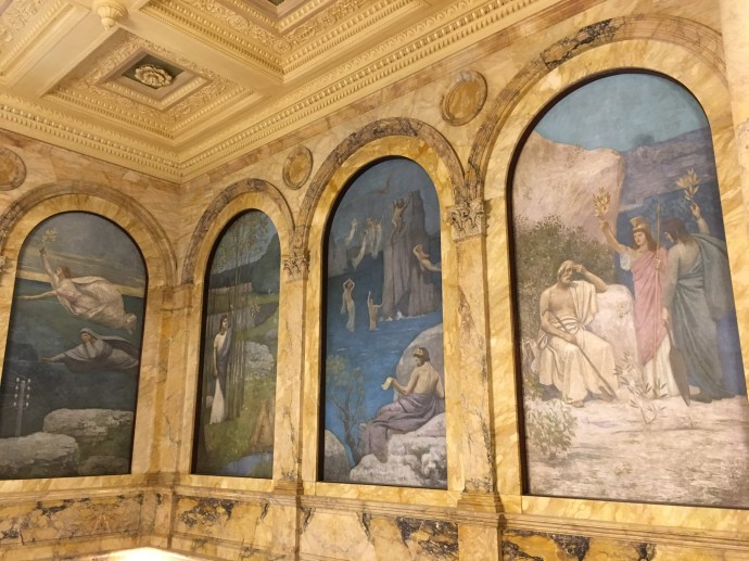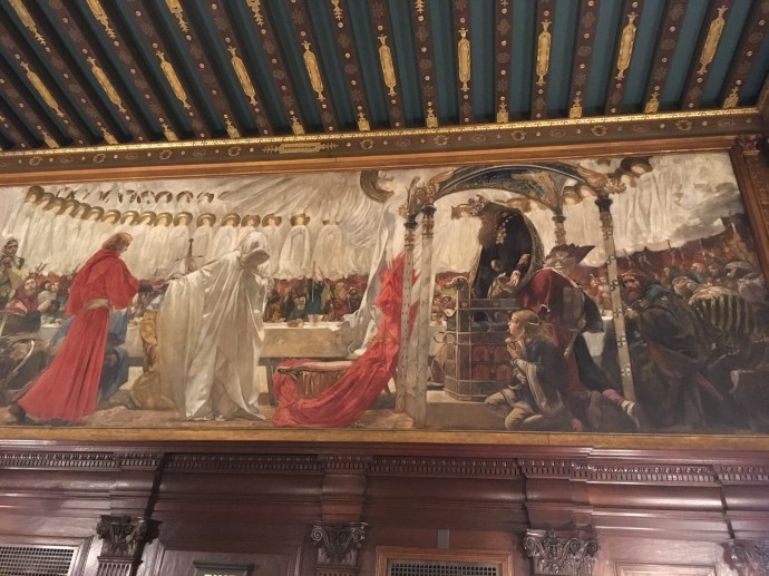 From the map room we headed to the murals. The murals are all located in the McKim Building, the 1895 building. Edwin Austin Abbey was an American who worked primarily in Europe. His mural is entitled “Sir Galahad’s Quest for the Holy Grail” and was installed in 1902. It is installed on all four walls below the ceiling in the Abbey Room on the 2nd floor. The 15 paintings depict the Arthurian legend.