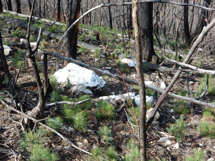 Baskin Creek trail was a bit of a surprise. Regrowth from the burn area was most pronounced here and the rocks appeared to be of a different type than otherwise seen. I am sure my brother-in-law in AZ would know the answer, but I will call it a white quartzite and go with that. We turned back after climbing to the peak of the trail, any further would have been a steep downhill which, since this trail is an out and back, translates into a steep uphill on the return trip.