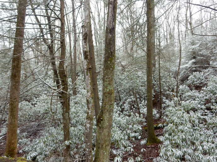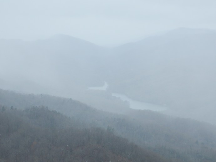 We drove up to Pinnacle Overlook to get a view into this corner spot where Kentucky, Tennessee and Virginia converge. The Gap itself rises 300 feet above the valley floor but is 600-900 feet below the ridges surrounding it. Our view from Pinnacle Overlook was limited; when we were there, the temperature was 31 degrees and falling sleet obscured the view.