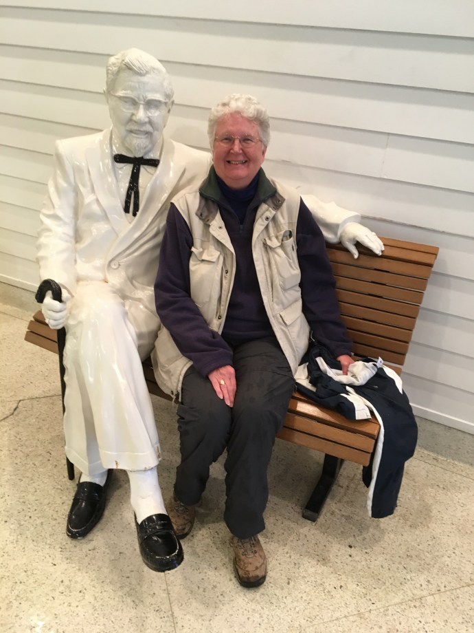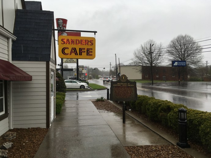 I have a story to tell. You may have heard it before. But we read it, or re-read it, today for the first time. We were in Corbin Kentucky, the place where Colonel Sanders began his Kentucky Fried Chicken empire. Harland Sanders was born in 1890 in Indiana. His father died when he was six. By age 10 he was working numerous jobs outside the farm. During his early years, he worked on a ferry boat, for the railroad, tried to be a lawyer (which ended when he got into a fight with his client in a court room), and ran a gas station. Sanders and a competing service station owner got into arguments over billboards providing directions to their businesses and the other owner shot and killed the national chain rep that was with Sanders that day. Sanders shot back and wounded the other owner.