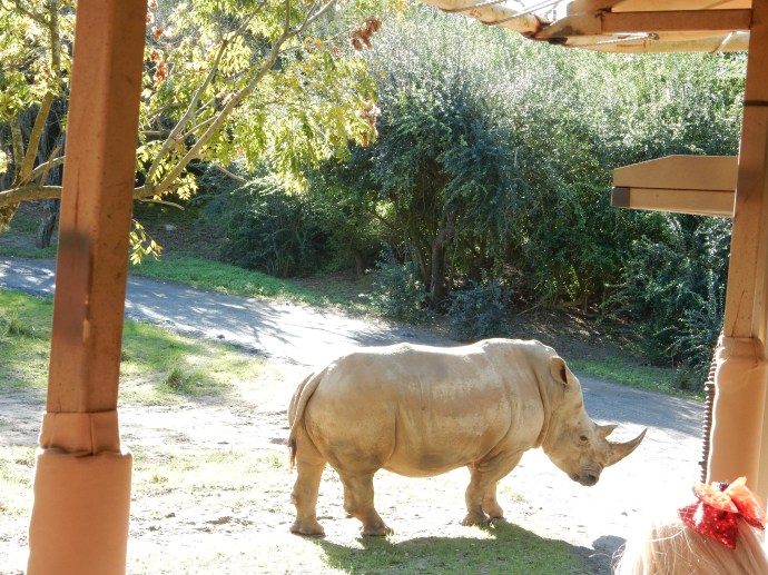 Back to Disney’s Animal Kingdom. Early arrival brought us to the gates around 8:30; gates were opening then. However, we had a glitch again and had to have guest relations re-authorize Sarah’s and Chris’ tickets to enter. We still made it to Na’vi River Journey before 9 AM and were able to easily enter the ride. From there we headed to Kilimanjaro Safaris Expedition and once again were ahead of the crowd for the 20 minute ride through various African terrains. Our ride was about 3 minutes longer as a rhino decided to park itself blocking the road just in front of us. We had to wait until it decided to back up enough for us to pass.