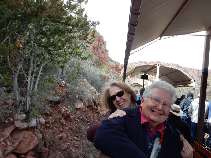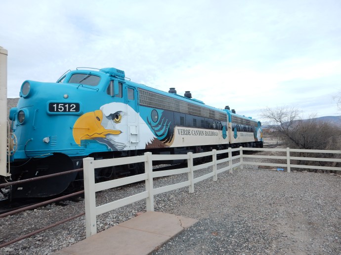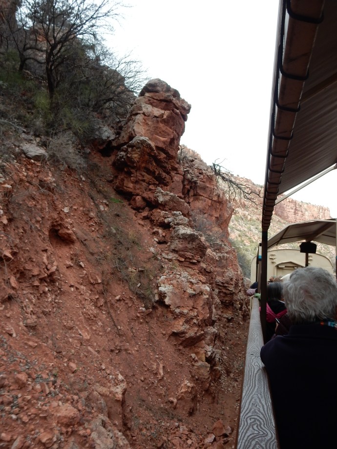 Once we leave the slag piles behind, though, the view is of plains, mountains, the Verde River, and the protected areas of two national forests and a wilderness area. Train trestles cross creeks and gullies that while dry today, must handle the flow from periodic flash floods. Train passengers must keep hands and heads inside since rock walls are just inches away. The coach cars are your base seating but each coach car has an open air car where passengers can sit or stand without windows or walls blocking the view. The winter’s leafless trees provide a view of the river not possible in other seasons. All the while, various colored cliffs and mountains loom in the background, providing a color contrast not presented by green leaves. Looking up, periodic cliff dwellings of the Sinagua peoples can be seen along the 20 miles of railroad track. All in all, it is a three and one-half to four hour journey.