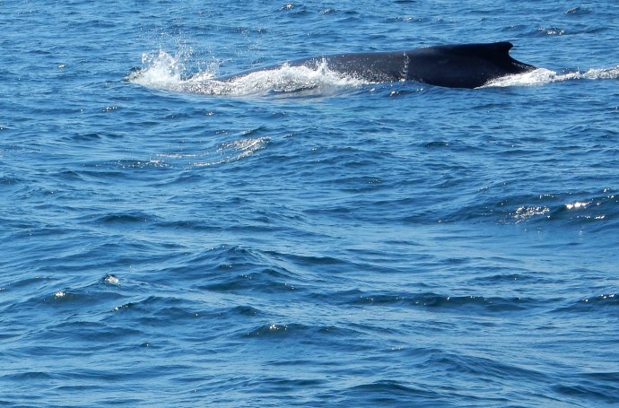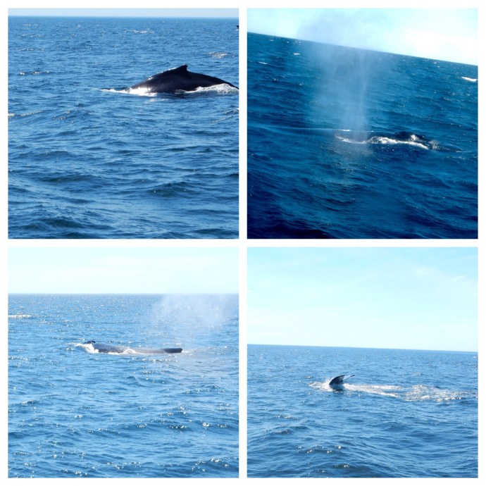 Saturday morning was an hour on the beach, sunny skies and temps in the mid-60s. We had a fresh fish lunch at Gloucester House restaurant overlooking the harbor before boarding the Privateer IV, the newest whale watching boat from Seven Seas Whale Watching. The boat offers indoor and outdoor seating. As we boarded, the seats outside were great, pleasant and sunny. After a brief tour of the Gloucester Harbor, we headed out to sea and the breezes picked up. Everyone added on their extra jackets and hoodies to stay warm in the breeze. Blue skies and blue water surrounded us on all sides.
