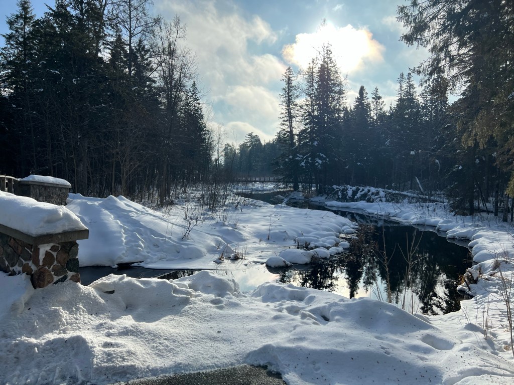 No trip up here could be complete without the requisite hike to the headwaters of the Mississippi River. Even in winter, the river starts out flowing as the water leaves Lake Itasca from under the mantle of frozen ice. Our first hike continues through the woods along Lake Itasca until we have to turn around when the trail stops due to the partially completed extension of a bike trail.