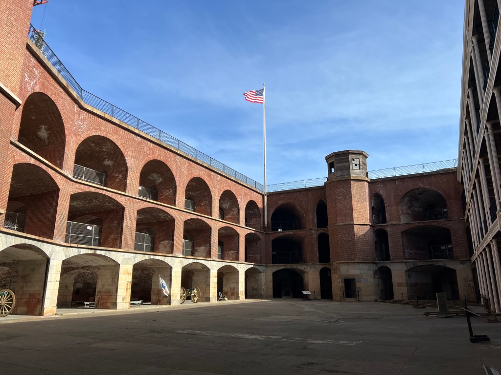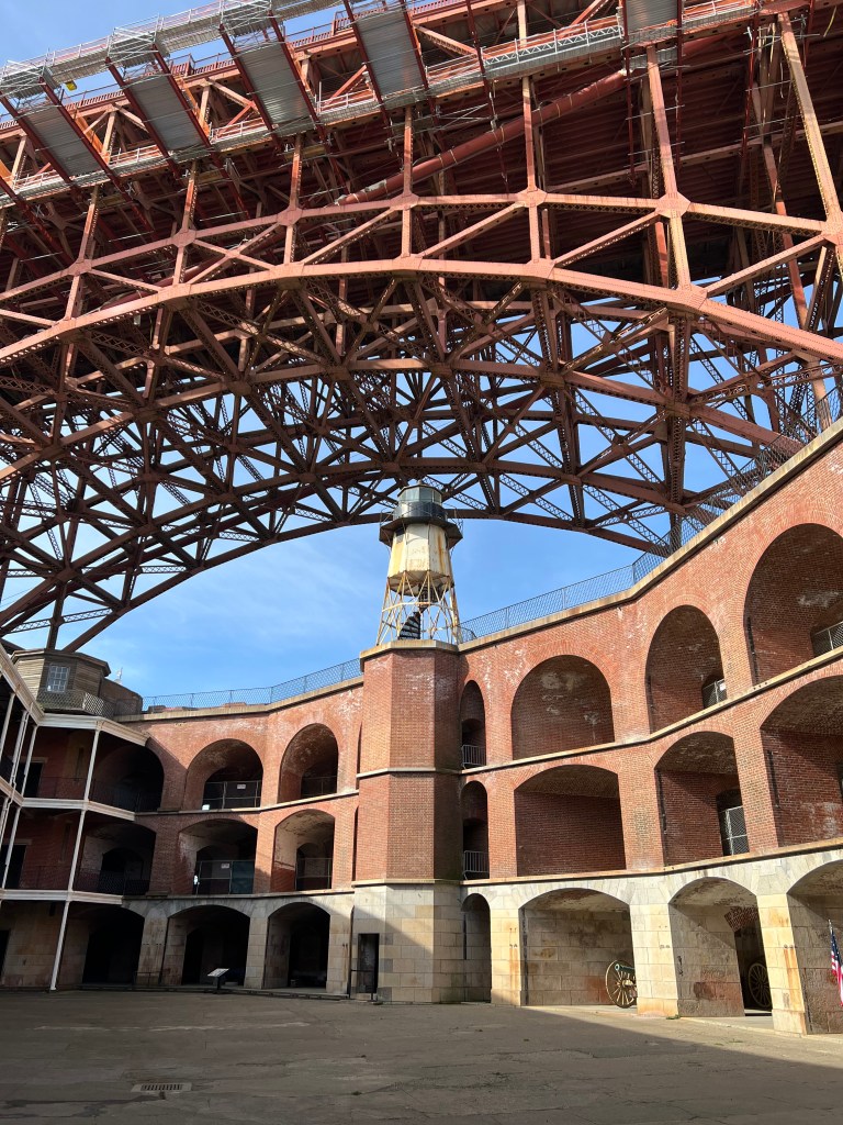 Our first real destination was Fort Point National Historic Site, reached by walking along the bay and restored shore lands from the Welcome Center. The fort is located right under the Golden Gate Bridge. Its primary claim to fame was as a coastal fortification guarding San Francisco Bay. Built from 1853 to 1861, the fort was built similar to numerous other forts on the east coast. The fort was built at the entrance to San Francisco Bay, at the site of a small Spanish fort dating back to 1776. Granite from China was combined with locally made bricks and earthen embankments to provide a three tiered fort able to hold 126 cannon. Fort Point was well preserved and additional improvements were underway to accommodate enhanced exhibits and displays.
