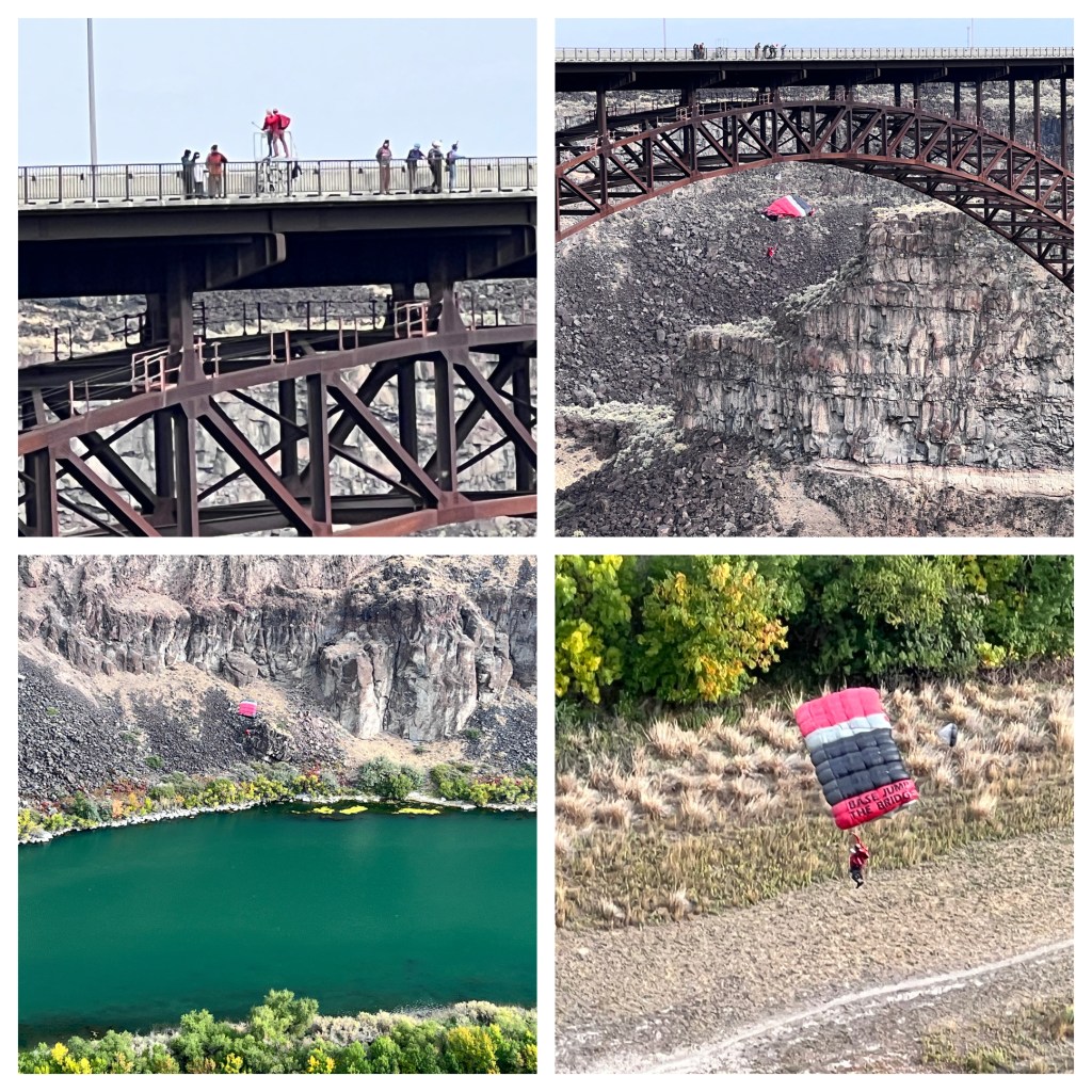 We had not realize that the Perrine bridge is one of the countries only bridges where people can do BASE jumping without obtaining a permit throughout the year. BASE is an acronym that stands for each of the categories of objects people jump from: buildings, antennae, spans, and earth, such as a cliff. A simple explanation: it’s basically strapping a parachute on your back and jumping off a bridge with hope that you land safely down below.