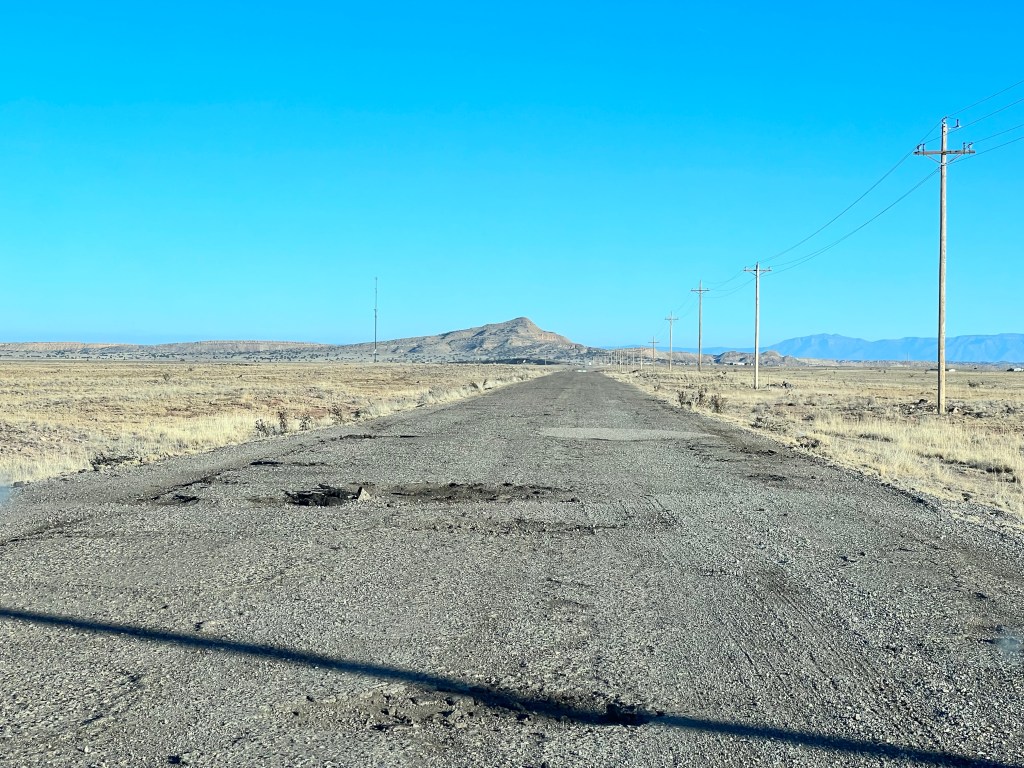 Because the Chain of Craters mountains go north to south, we had to re-trace our path and go back north to visit the rest of El Malpais National Monument and to reach our lodging for the night. On the way back, we stopped at the Bureau of Land Management ranger station and talk to a park volunteer. While the gentleman lives in Albuquerque, he is from Kenosha WI. We mentioned that we knew a woman who was from Kenosha and her parents had owned Mullen’s Store there. He recognized the store name from his childhood.