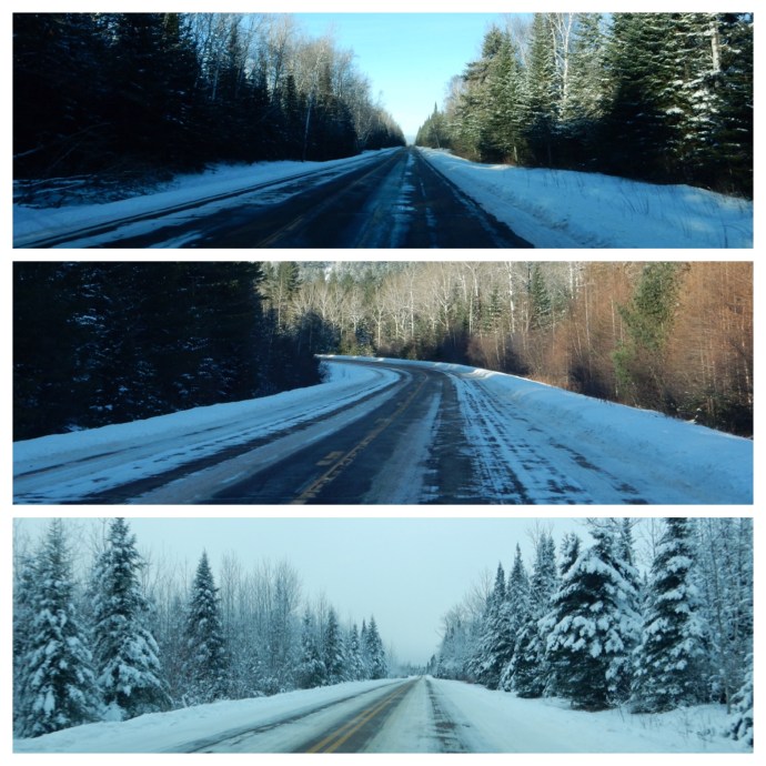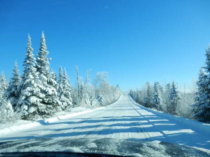 The Gunflint Trail is a 57 mile scenic byway stretching from the city of Grand Marais on Lake Superior northwest to the Canadian border. The landscape is a transition zone of the boreal forests (fir trees) and the hardwood forest, interlaced with lakes, rivers, and bogs. The drive begins as an uphill drive from the lakeshore up the cliffs into the forests. The road is paved but given the snowy weather, the clear pavement gradually becomes more snow-covered as we drive further inland.
