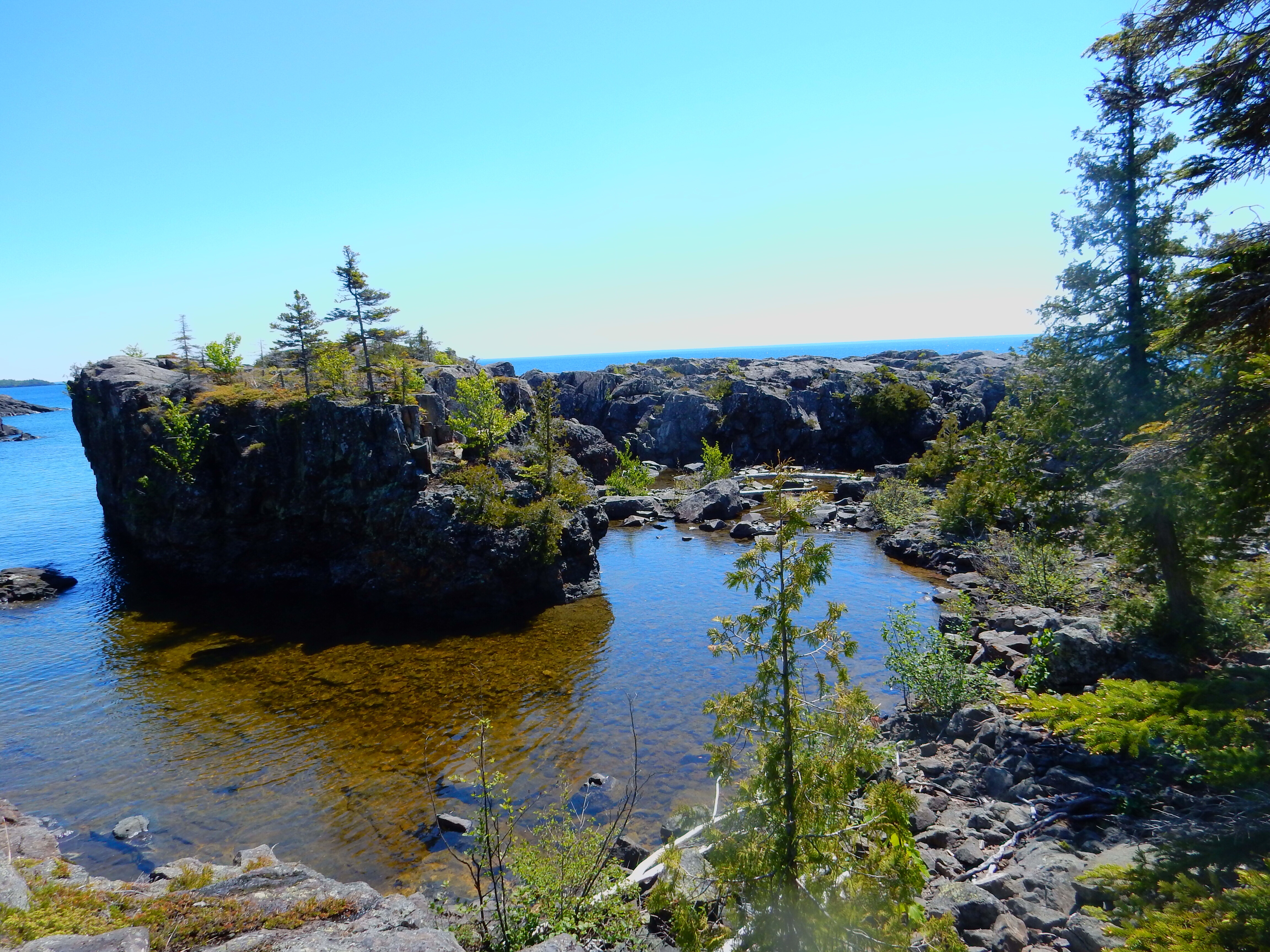 Today was no exception. All night long the fog was heavy outside our cabin. The Voyageur II left at 9 AM EDT and the harbor was socked in. As we traveled around the island, picking up stray backpackers from small, isolated docks, the fog eventually dissipated; the views of the rocks and forests of Isle Royale are much more spectacular with blue skies and bluer water. Then, as we arrive in Grand Marais this evening, the fog is present again as a light mist covering the ground.
