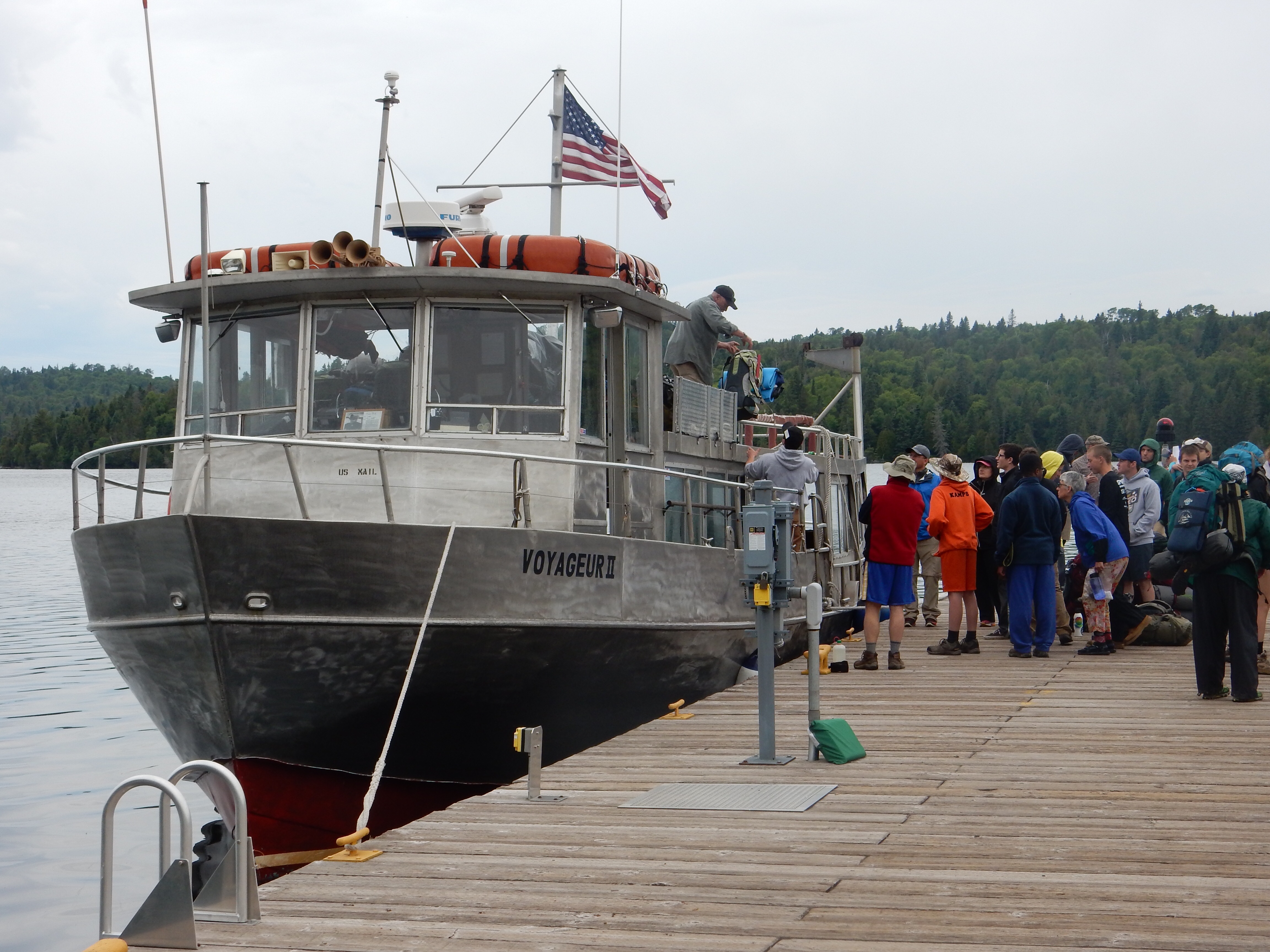 Several of the people returning with us are like old friends; the couple from Minocqua, the Montana couple that ran in Grandma’s Marathon, the Iowa party getting on at Malone Bay after backpacking. We joke about the boat ride and hope today’s return trip will be smoother. It is. But the length of the journey has only increased. The pick up of backpackers from remote locations requires slower speeds in narrow channels and extra time to go in and out of pick-up points. All in all, we enjoy the smoother trip and better scenery. We congratulate ourselves for tackling another adventure.