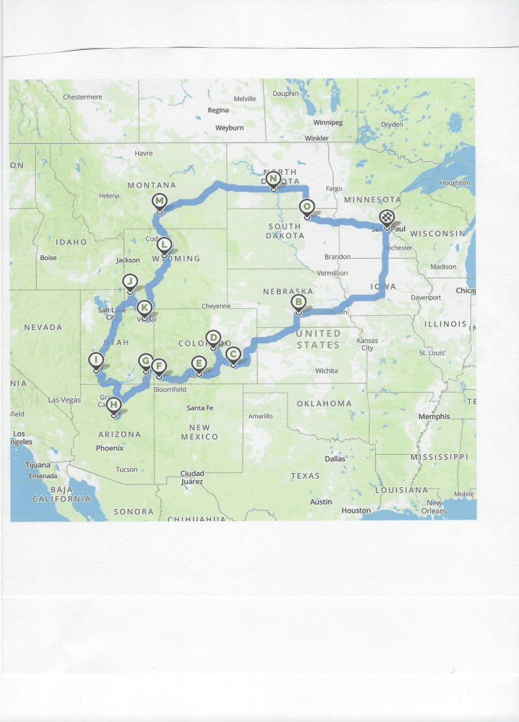 Day one was a chance to see if we have remembered how to travel. This trip will take us to Flagstaff Arizona through Kansas and Colorado and returning home through Utah and Wyoming. The car is not overstuffed; of course the top of Pikes Peak will probably be as cold as we get for the next 19 days. So there is no need for winter clothing.