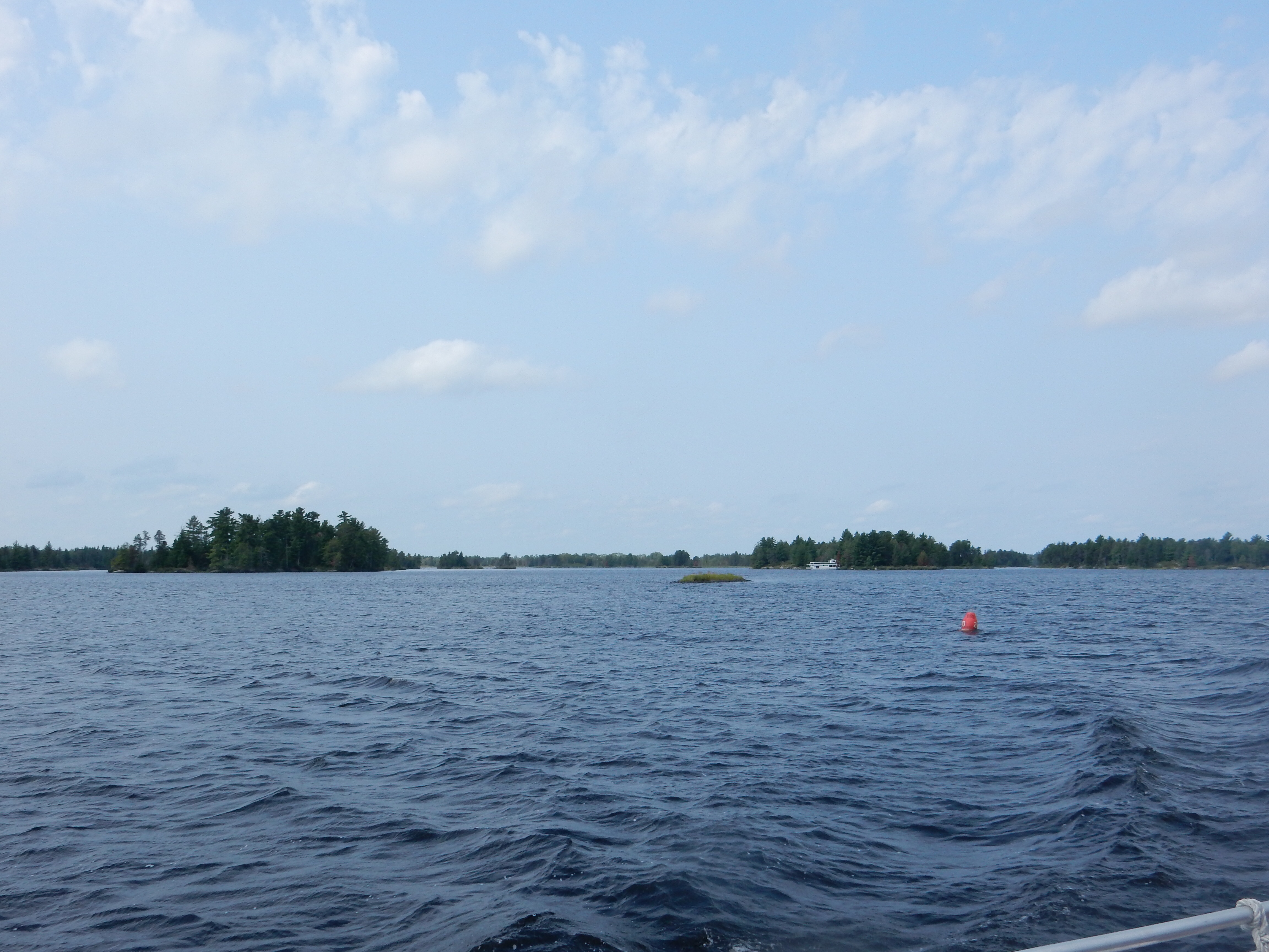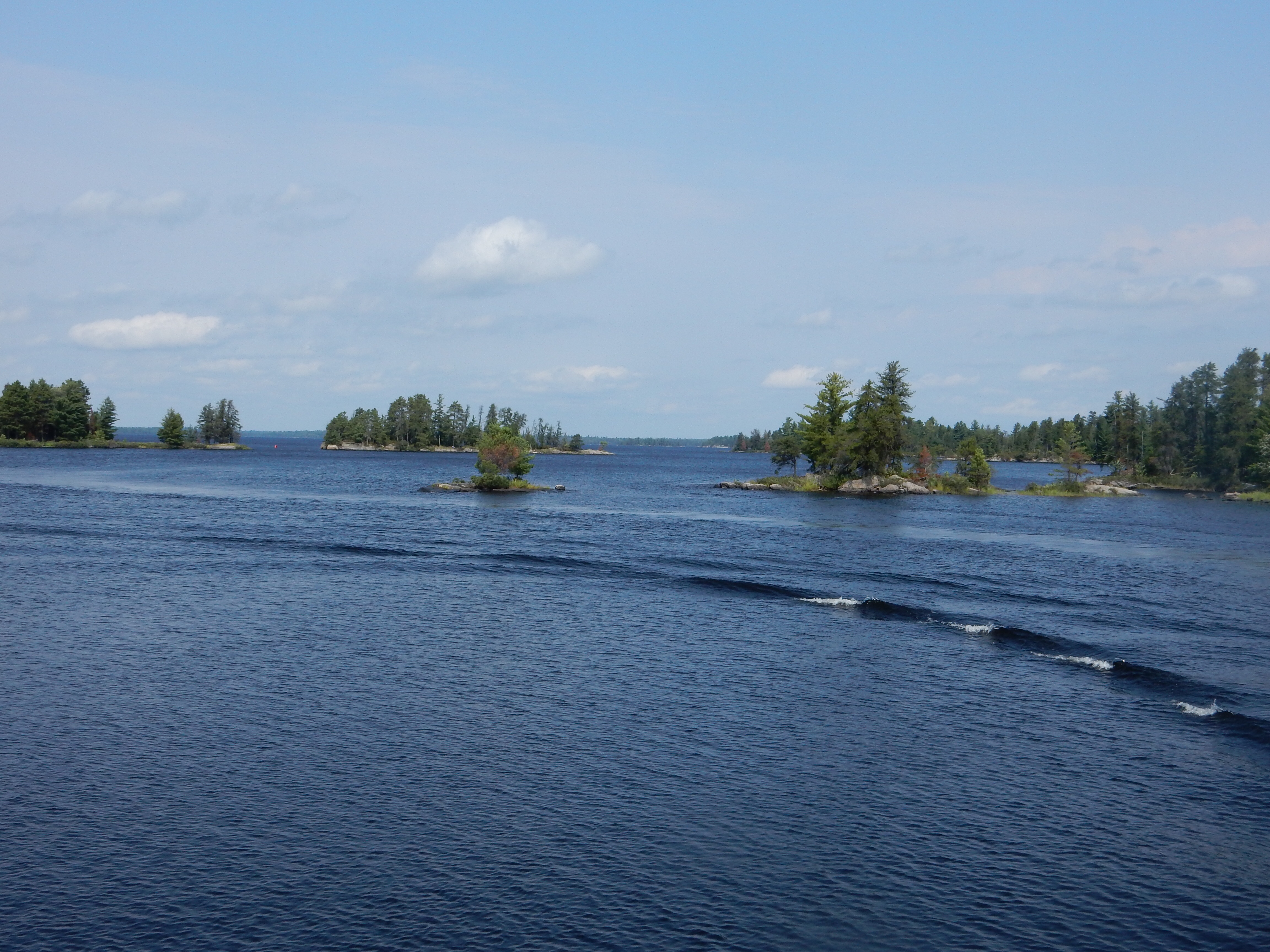 While Rainy Lake is large, we were normally in view of islands or the Kabetogoma peninsula. So land was normally a reassuring visage. People were out fishing and the houseboats here are tied up to trees or iron rods driven into the ground. None of that hole digging for anchors that we had to do at Lake Powell. The morning ride was generally with sunny skies. By the time of our afternoon return journey, the skies were dark, some rain came down, and the wind and waves had picked up, but still at a tolerable level.
