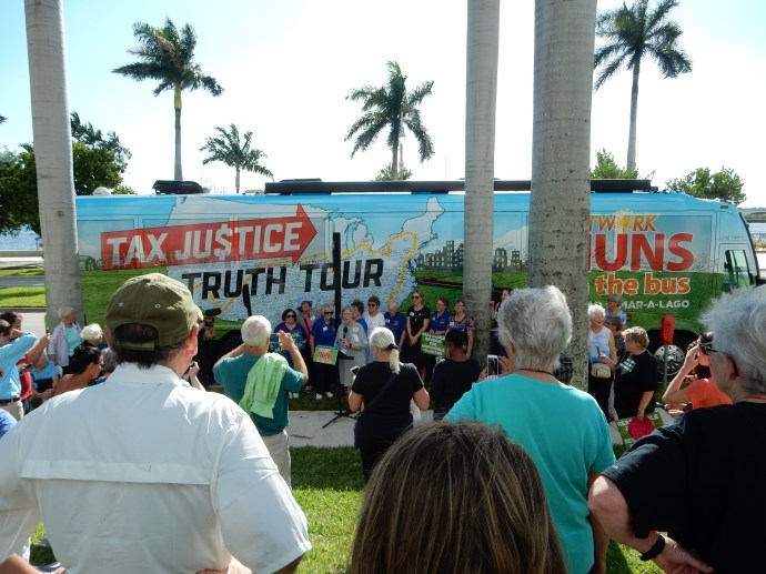 This is the 6th time they have made a similar cross-country trip for justice. This trip began 27 days ago in California and ended today with a gathering that drove by Mar-a-Lago. Last night, they held one of their town hall meetings to explain the tax bill. Their explanation is easily understood. I will see if I can briefly highlight it. (They made it easier to visualize by having five individuals represent a person they actually met on the tour who are in one of the five quintiles.)
